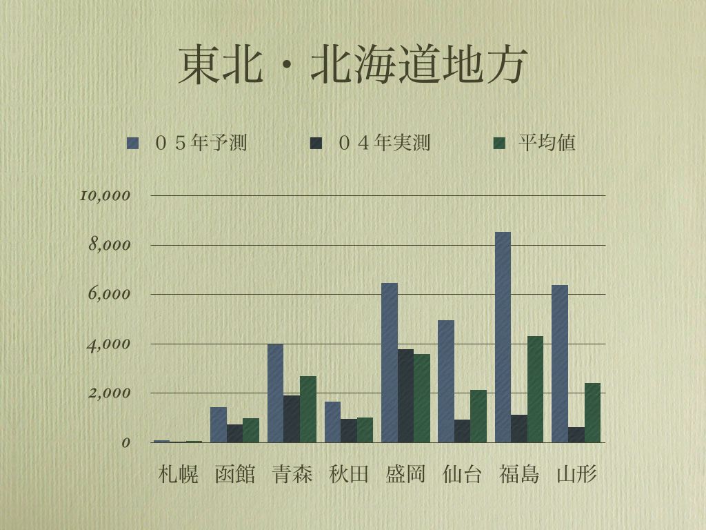 北海道地方の飛散開始は4月。道南では1,000個/平方センチを超える見込みです。東北地方南部では2月下旬から飛散開始、
